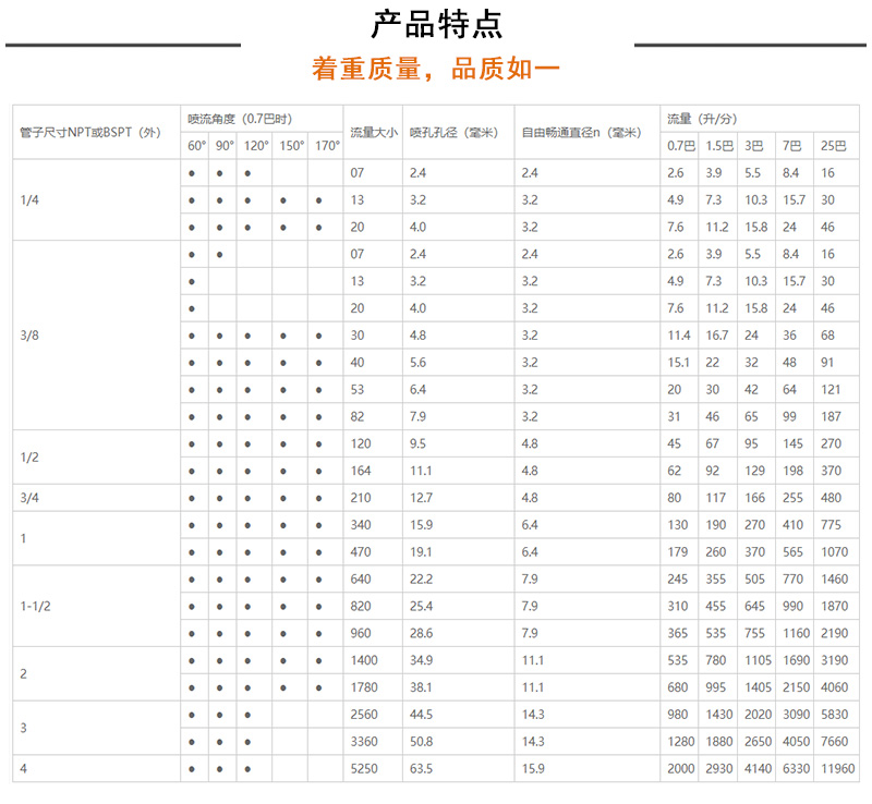 就喷射角度来说,螺旋喷嘴有60度、90度、120度、150度、170度等;就喷雾模式来说,螺旋喷嘴有空心锥形直喷、实心锥形直喷、空心锥形切向型、空心锥形双喷等;就尺寸大小来说,螺旋喷嘴从1/4英寸至4英寸;就流量大小来说,3公斤压力下5.5升/分钟到4140升/分钟;就材质来说,螺旋喷嘴有PP、PVC、尼龙、PE、赛钢、PVDF、PTFE、TELFON、F4、陶瓷、304不锈钢、316不锈钢、316L不锈钢、碳化硅等。