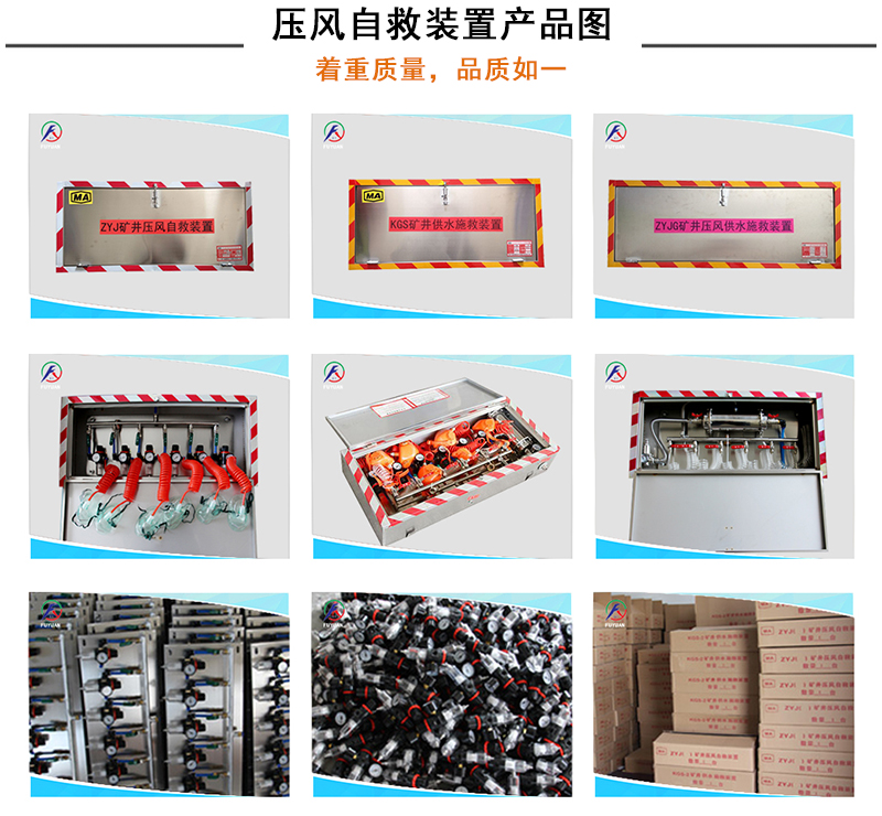矿用压风自救装置包括箱体,箱体上设有压风接头,其内设有多组分别与压风管相连的呼吸器,每组呼吸器的支管上均设有手动进气阀。当作业场所发生有害气体突然涌出、冒顶和坍塌等危险情况时,现场人员来不及撤离,可就近利用压风自救装置实行自救。打开门盖,取出呼吸面罩带上,钮开进气阀,通过供气量调节装置对压风管路提供