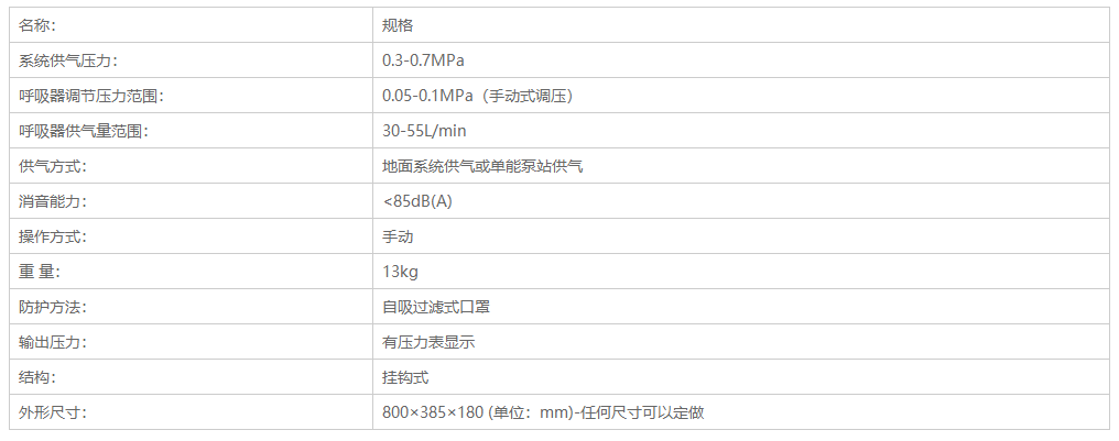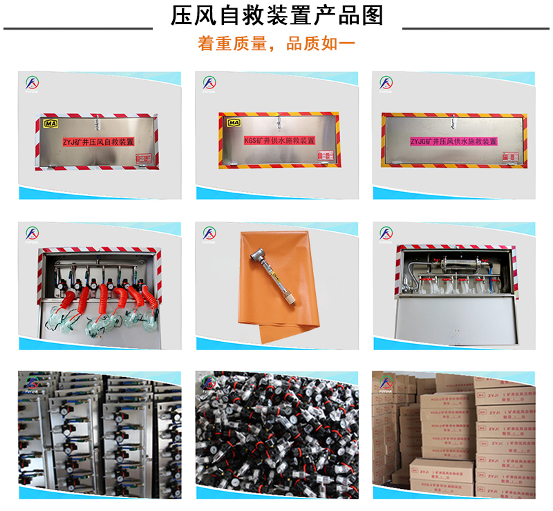 矿用压风自救装置包括箱体,箱体上设有压风接头,其内设有多组分别与压风管相连的呼吸器,每组呼吸器的支管上均设有手动进气阀。当作业场所发生有害气体突然涌出、冒顶和坍塌等危险情况时,现场人员来不及撤离,可就近利用压风自救装置实行自救。打开门盖,取出呼吸面罩带上,钮开进气阀,通过供气量调节装置对压风管路提供